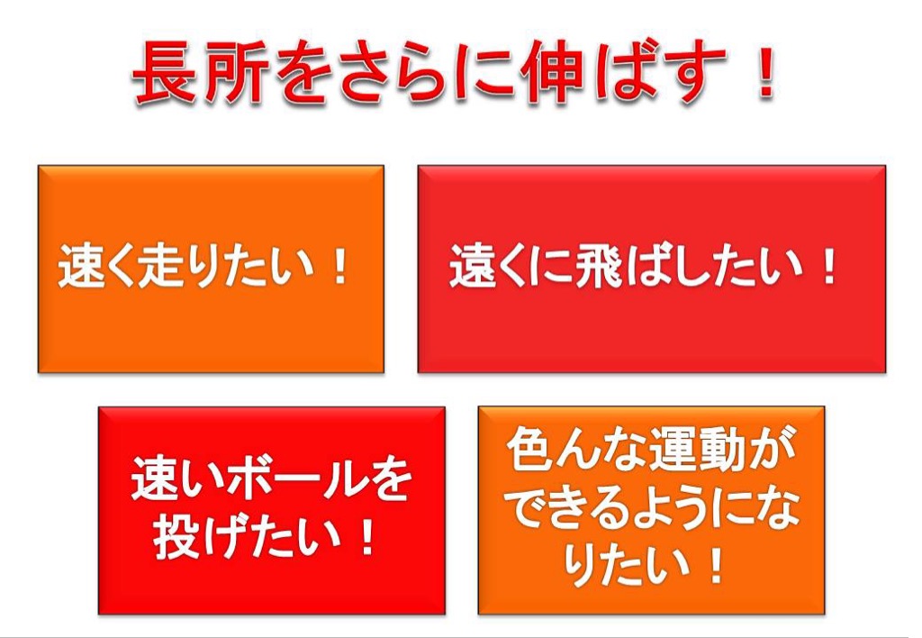 当教室のスポーツ教室では、学校体育や競技スポーツで活躍するための運動プログラムを構築しております。