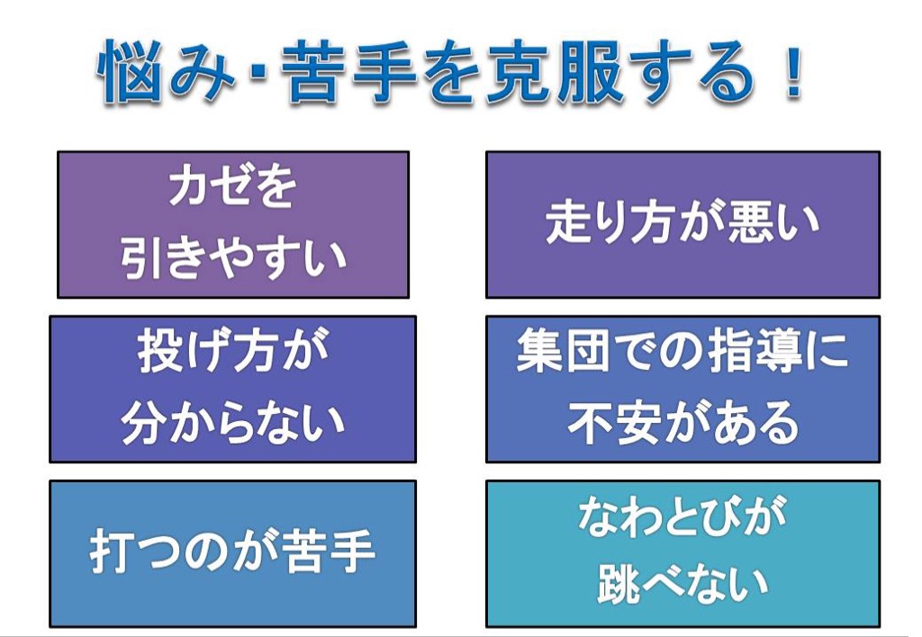 運動・スポーツを「できるようになる」ことによって、自己肯定力を育み、次へのステップに踏み出すサポートをさせていただきます。
