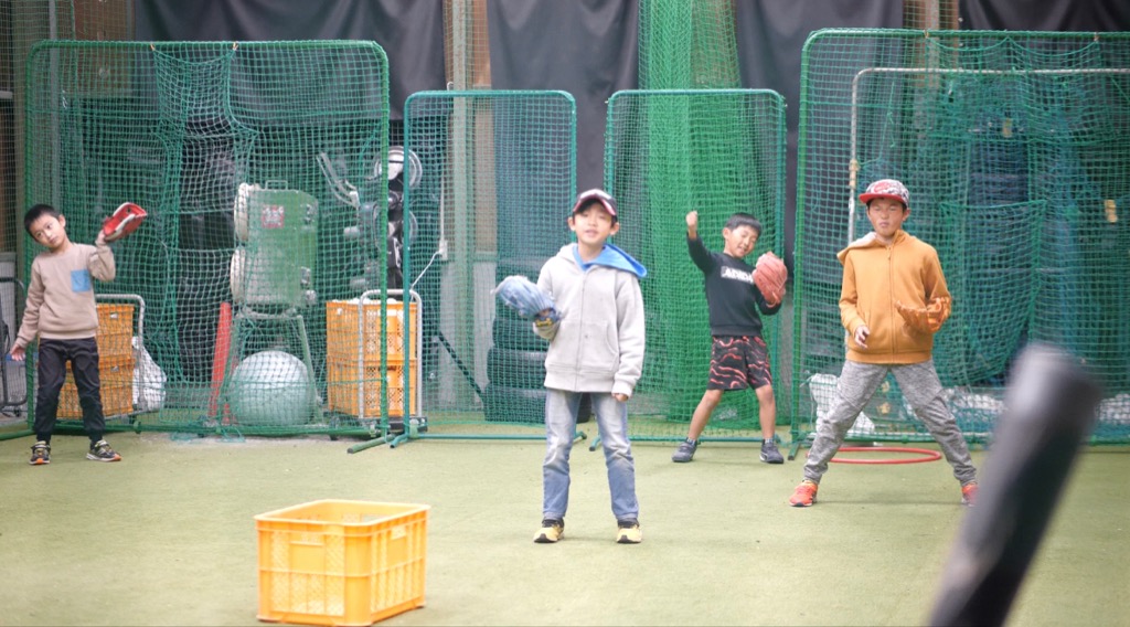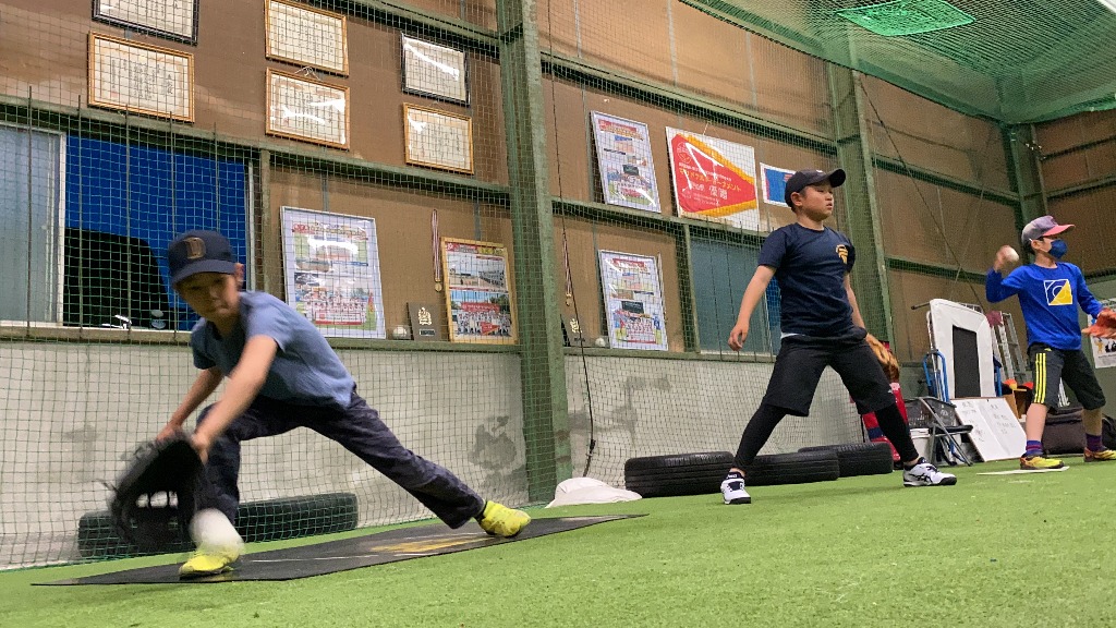 当教室でも打球処理とスローイングの練習を行っていきますが、数多くのバリエーションを身につけるために、週によって、課題を変えていきます。